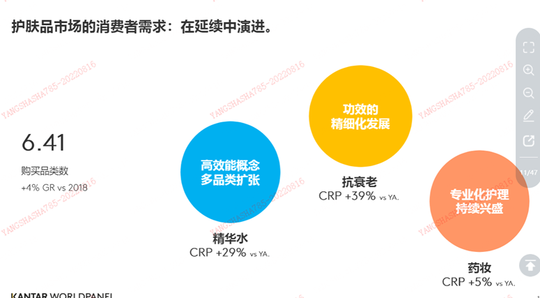 消费者需求包括高效能概念多品类扩展,功效的精细化发展、专业话护肤持续兴盛。CRP增长5%-39%。