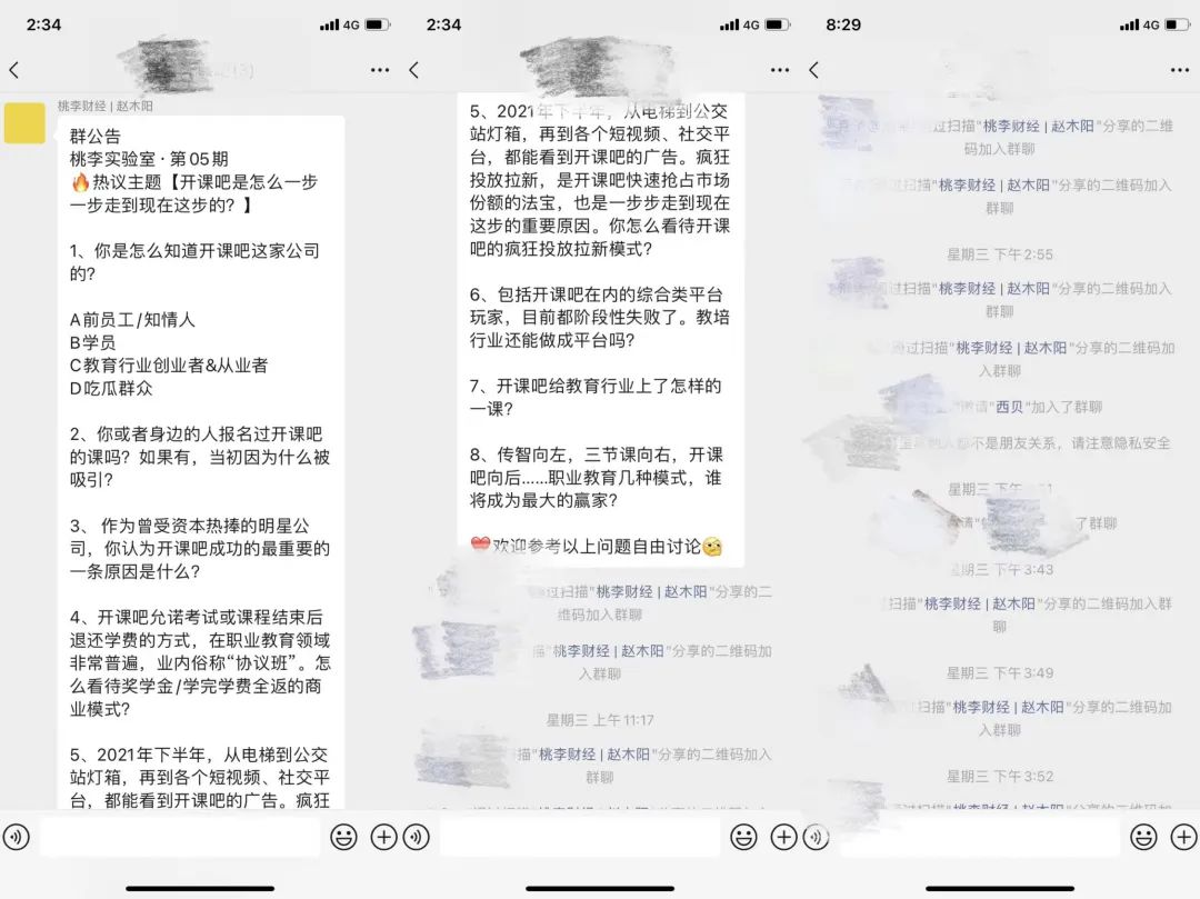 • 10月26日-10月27日,通过桃李财经社群、朋友圈等渠道,发布群二维码,快速建立24小时快闪群。桃李编委会将预设的问题发到群中,并引导讨论。最终,有近200人群进群围观。他们中有的是开课吧前员工,有的是被欠款千万的信息流广告供应商,有的是密切关注开课吧的教育行业从业者,还有的是“吃瓜群众”。