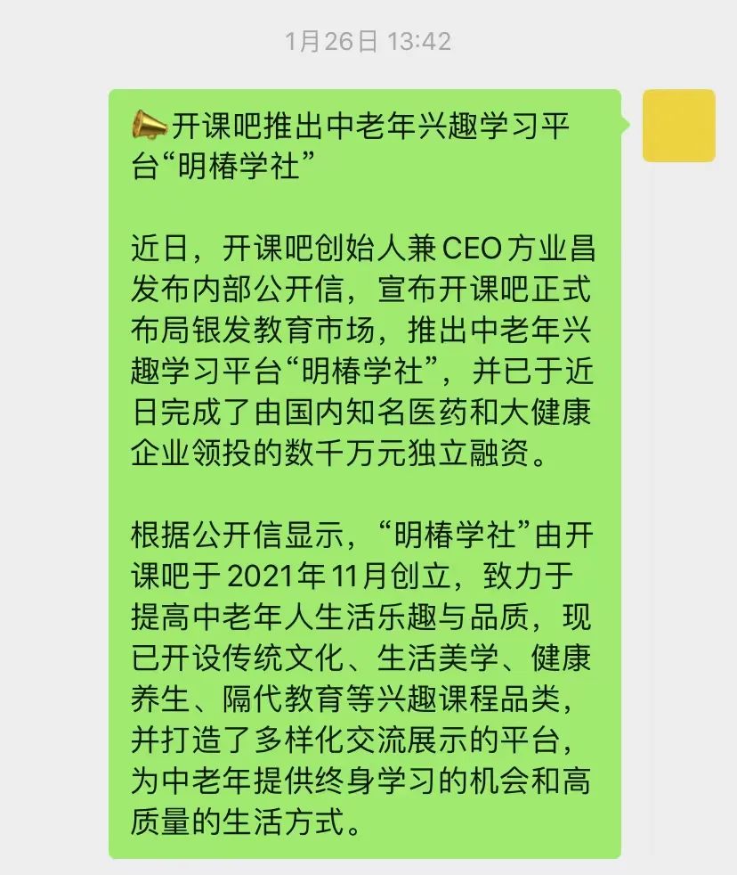 开课吧最初诞生于方业昌2010年创办的慧科教育集团。2013年8月正式上线后,专注于培养符合新时代发展趋势的复合型和应用型人才。2020年8月,开课吧正式宣布从慧科集团拆分,并独立获得A轮融资5.5亿元。2021年7月,再次宣布完成6亿元B1轮融资。围绕“作为曾经备受资本追捧的明星公司,开课吧成功的最重要的一条原因”,群友展开讨论: