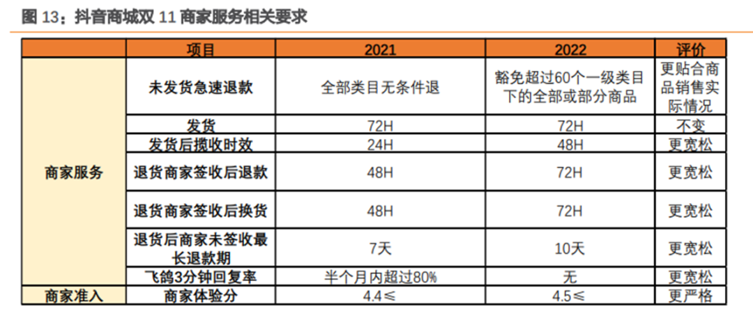 据天风证券研究发现,相较去年各类商品的负面指标限制是一刀切,抖音商城今年给不同类目提出了不同的指标要求。但是,统计均值会发现,抖音商城规定的品退率、投诉率都变得更宽松,分别由去年的≤0.53%改为≤0.95%,由去年的≤0.06%改为≤0.16%,但是差评率的均值却由去年的≤0.4%改为今年的≤0.29%。