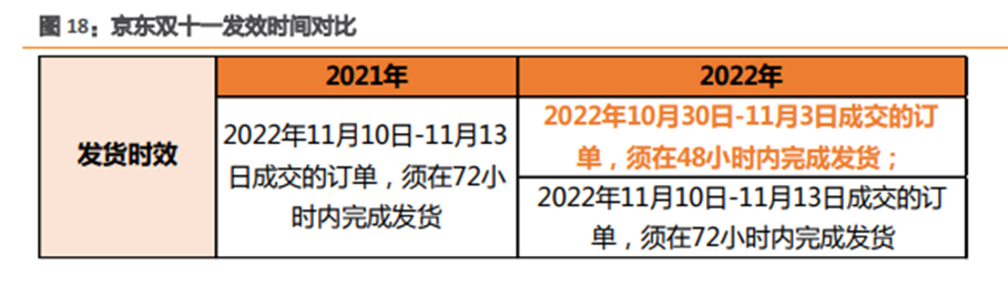 京东的发货时间继续与淘宝系锁定在一天的领先差距,京东规定“10月30日到11月3日完成的订单,须在48个小时完成发货了”;而且商家现在必须开通极速审核服务,开通服务的6小时以内必须要审核售后服务单,若超时系统将自动回复并退款;预售商品都是默认包邮的。