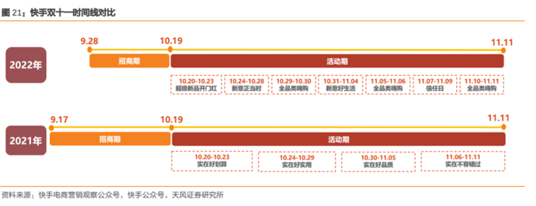 去年9月17日,快手启动了招商,今年9月28日快手启动招商,虽招商向后延,但快手称之为“116心意购物节”的大促仍然从10月20日就启动了,大促截至到11月11日收尾,相比其他平台,快手相当于直接把战线拉长、并前置了,这其中又有若干个小高潮:10月29日-10月30日,11月05日-11月06日,11月10日-11月11日都属于快手的全品类嗨购日,快手还设置了像万人砍价团等加强预售蓄水的活动。