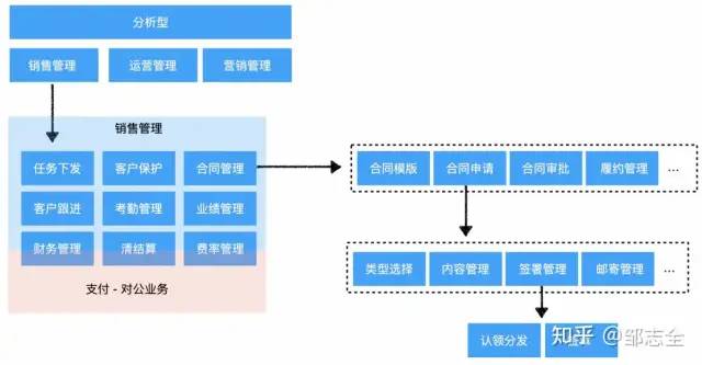 其中销售管理又可以细拆成“任务下发”、“客户保护”、“合同管理”、“业绩管理”等能n多能力,然后合同管理具有自己的大流程,模版管理、合同申请、签章、审批、履约等等,申请过程具备自己的流程:选择类型、填写内容、签署、邮寄等等,然后每个功能点又具备自身的细分功能点。