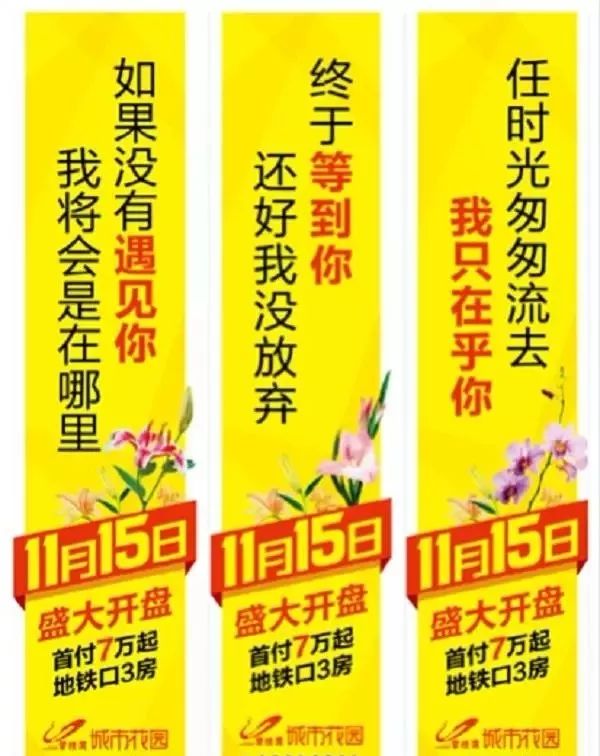 比如“任时光匆匆流去,我只在乎你”,说的是任凭时间过去,任凭其他楼盘再贵再好,你只选这个楼盘就够了。或者“终于等到你,还好我没放弃”,以前你可以放弃其他楼盘,幸好你没有放弃我们这个楼盘。