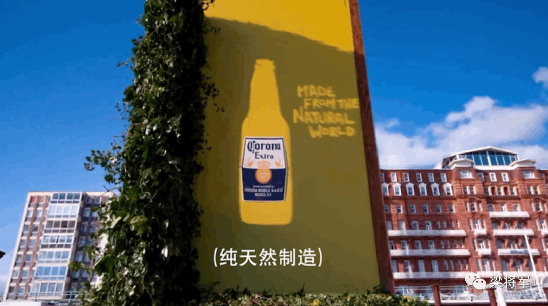 科罗娜做过一个户外广告,表面上看只是一个品牌标签贴在墙上,但随着日照的迁移,阳光就会透过墙边的绿植,在墙上投射出酒瓶形状的阴影。这就是通过改变广告形式,超越了用户预期。
