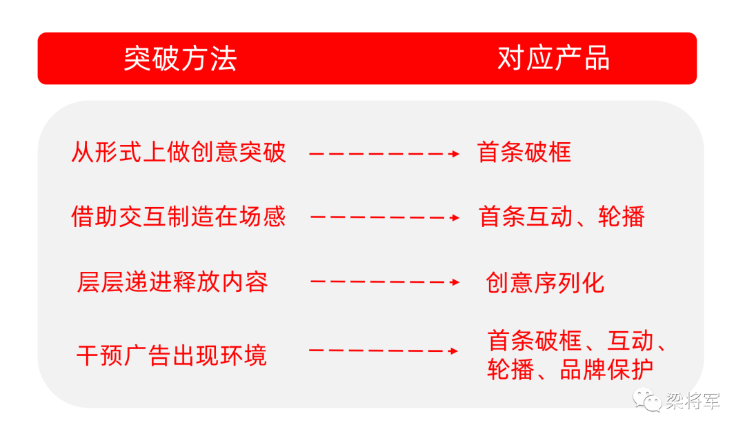 回顾一下,我们一共消化了四个创造内容体验的思路:在形式上做创意突破、借助交互制造在场感、层层递进释放内容、干预广告出现环境。以腾讯广告最近升级的产品为例,看一下该如何选择对应的产品解决方案: