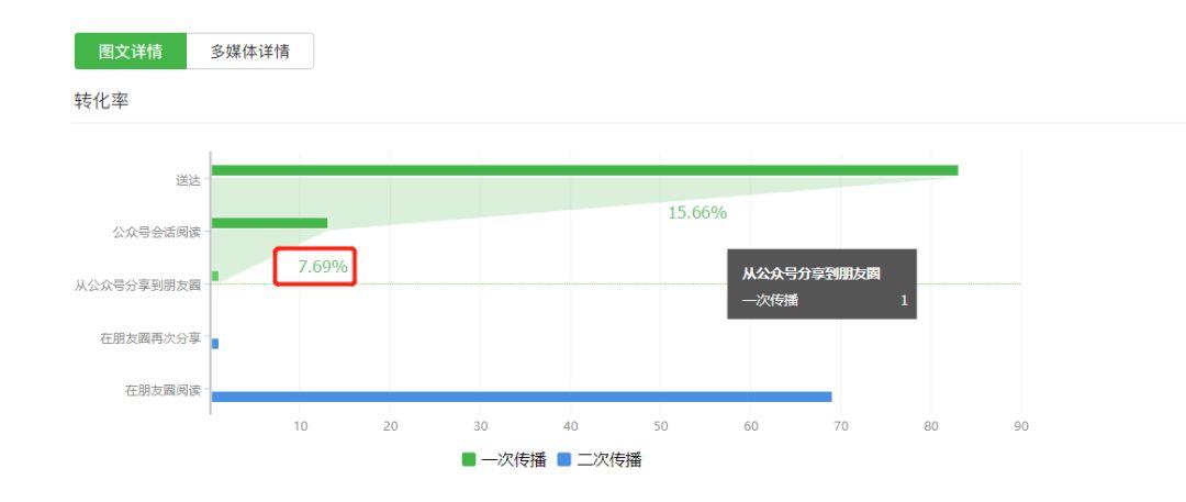 我建议看——号内分享率,即,现有公号粉丝里,有多少人看完你内容后选择分享,我们要这个比率,对应公号后台的「一次传播」。
