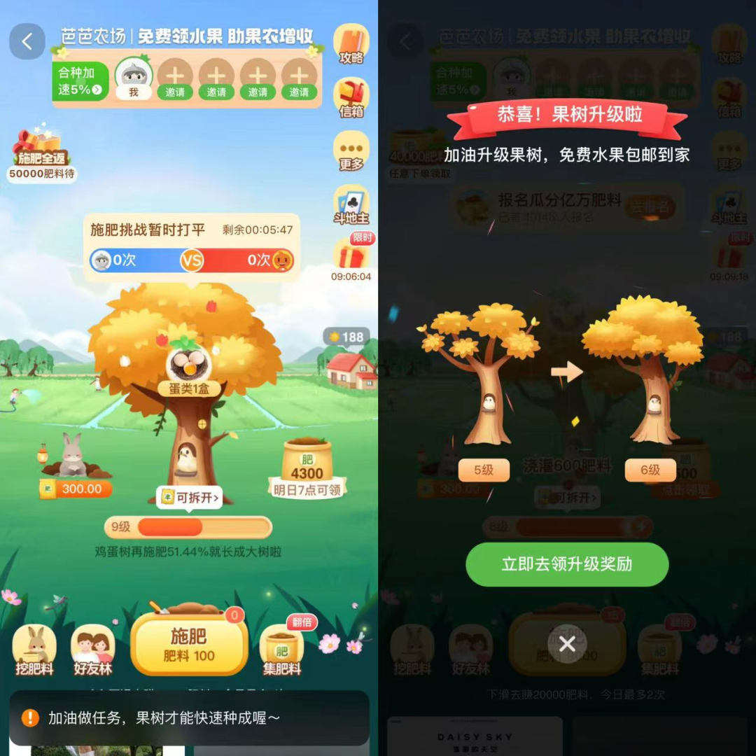 如芭芭农场用户参与前期升级果树成长的路径很快,升级新等级时还会再附赠升级礼包,可能是浇灌加速卡,可能是肥料,这也是游戏的良性循环,用户完成指定任务👉得肥料浇灌升级👉升级获礼包👉看到进度条向前移动,得到反馈从而持续投入,周而复始。