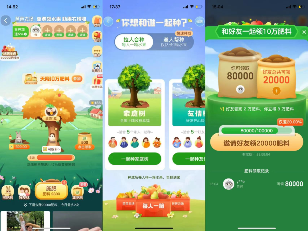 - 邀请好友参与,好友得2万肥料,你立可得8万肥料,利己的引导话术;