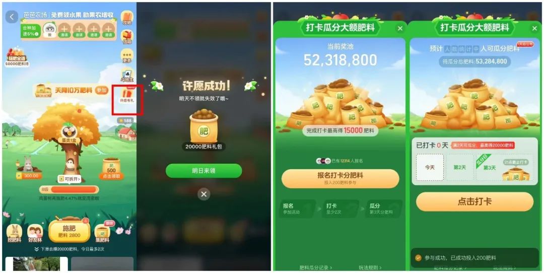 - 瓜分大额肥料:通过所有报名用户投入的200肥料为总奖品,三天打卡成功用户们瓜分未打卡成功用户投入的肥料;