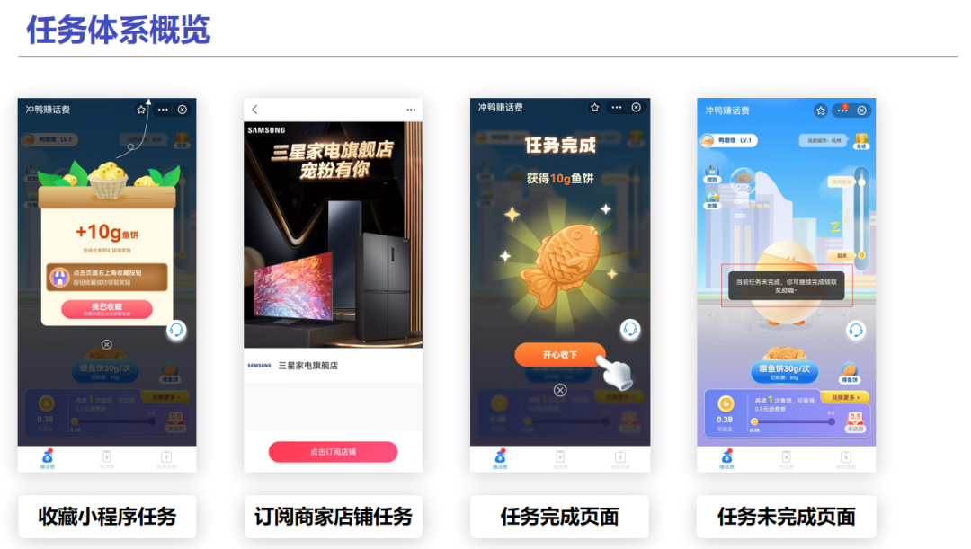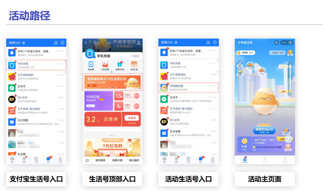 支付宝手机充值生活号的核心用途即为“充值”,本次活动以“养成”为核心,将充值与养成巧妙结合,体现在活动名称上——冲鸭(充呀),以拟人化的方式减少活动的营销气息,更容易被用户所接受。