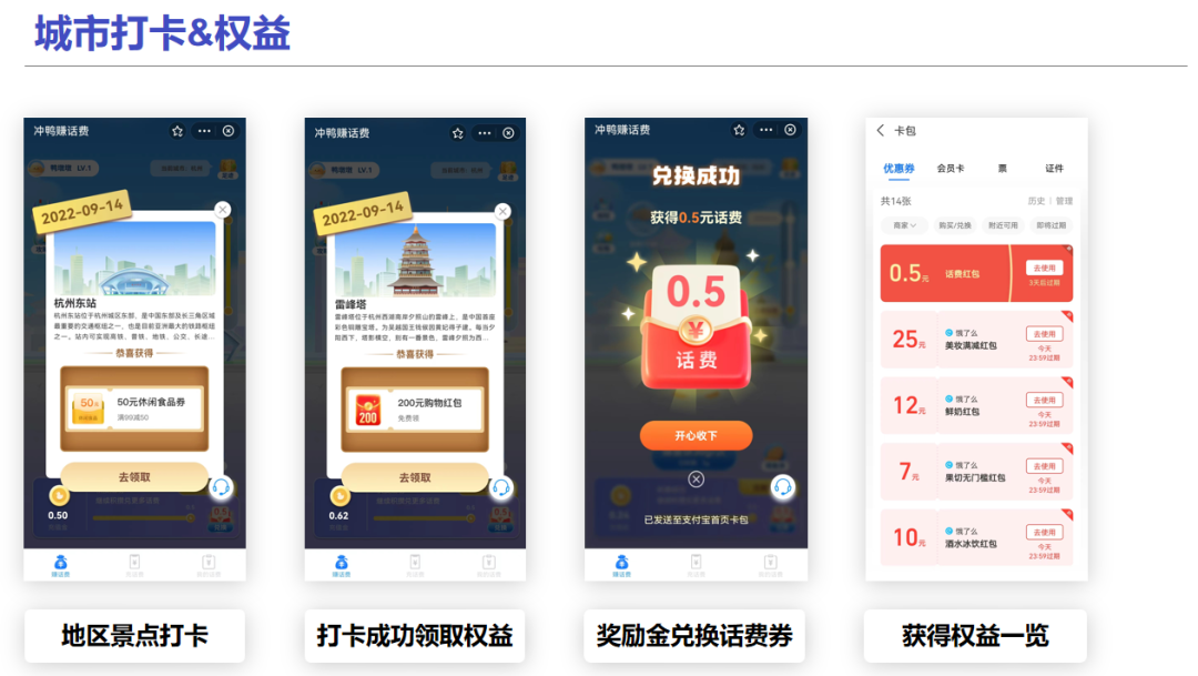 利用鱼饼投喂鸭鸭即可让其进行旅途的前进,前进中,鸭鸭会进行该区域的景点打卡,并获得充值金,用户可以利用获取到的充值金来进行各种面额话费券(0.5-10元不等)的兑换,也可选择兑换其余商品优惠券;