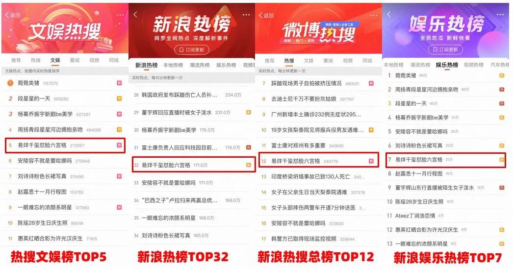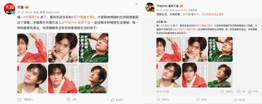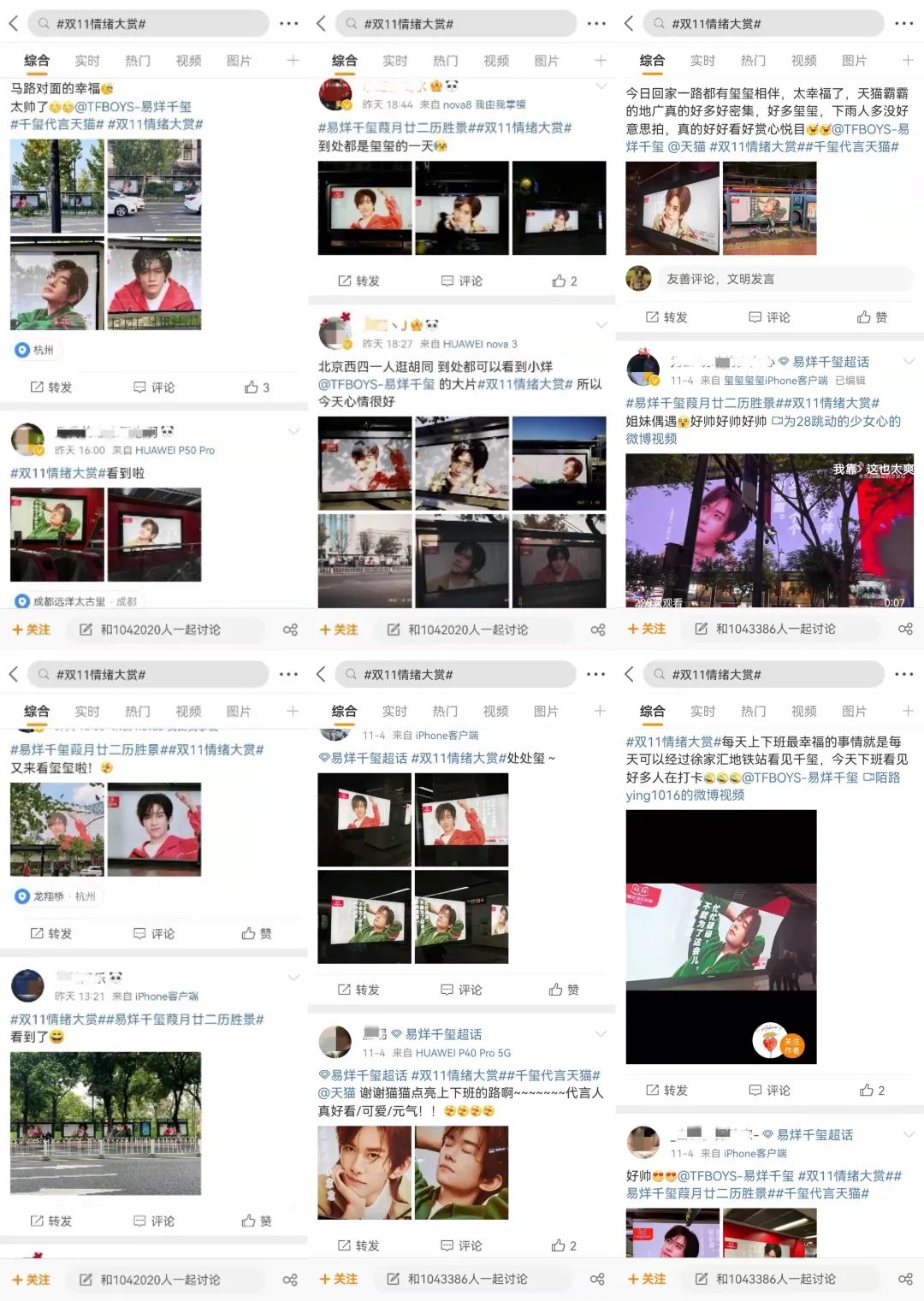 粉丝互动短时间内便引发#双11情绪大赏#、#易烊千玺怼脸六宫格#等微博话题扩散传播,讨论量更是达百万,高流量话题也吸引了更多路人网友参与讨论,一波波随手拍的晒图助推千玺大片强势出圈。
