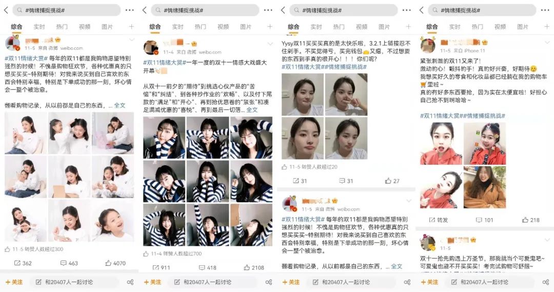 如何准确调动大众情绪,让共鸣感更深更进一步?天猫随后发起的#情绪捕捉挑战#的全民微博互动话题,撬动大量KOL、KOC和网友真实参与情绪演绎,网友自发晒图的表情特写让话题讨论热度高涨。在表达自己的双11理想生活情绪中,天猫双11代言人传播也变得更立体、更丰满。