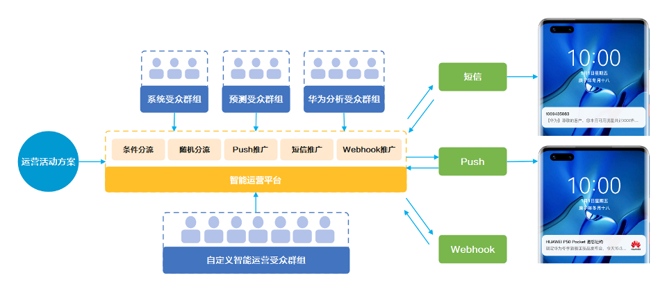 华为用户增长运营解决方案,通过华为分析,深入分析应用内用户行为数据,结合情景智能推送(短信、push和应用内消息),针对不同细分用户、不同场景做智能推送,实现用户拉新、促活、付费转化、流失召回等运营场景。