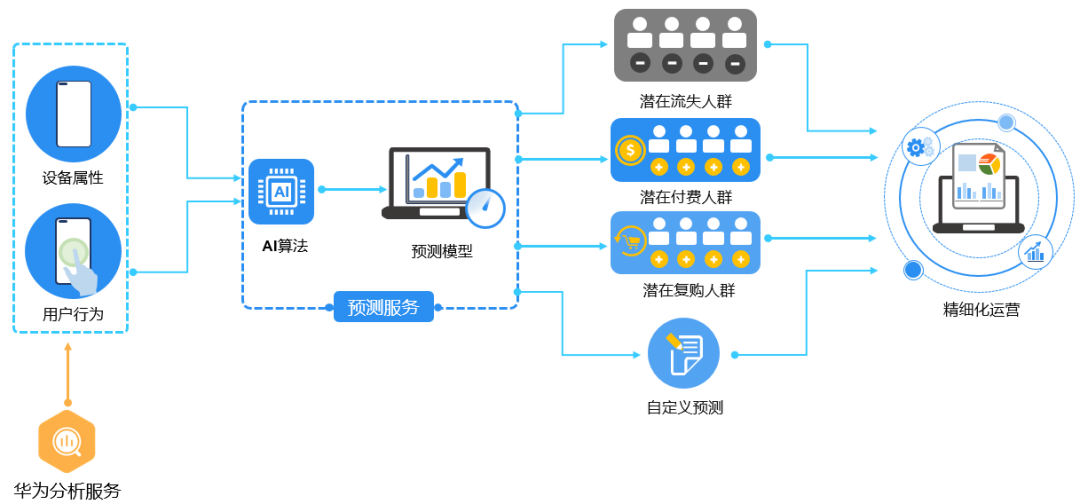而华为的预测服务主要做的算法类标签,推荐算法类人群。预测服务基于华为分析上报的用户行为数据和属性,结合机器学习技术,对特定目标人群进行预测,主要为流失用户预测、用户付费潜力预测、复购用户预测。