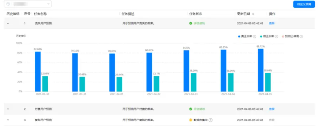 而服务预测主要功能包含,管理预测任务、评估数据质量、预测用户分布分析/TGI分析。主要为流失用户、用户付费潜力、复购用户3种用户的预测。