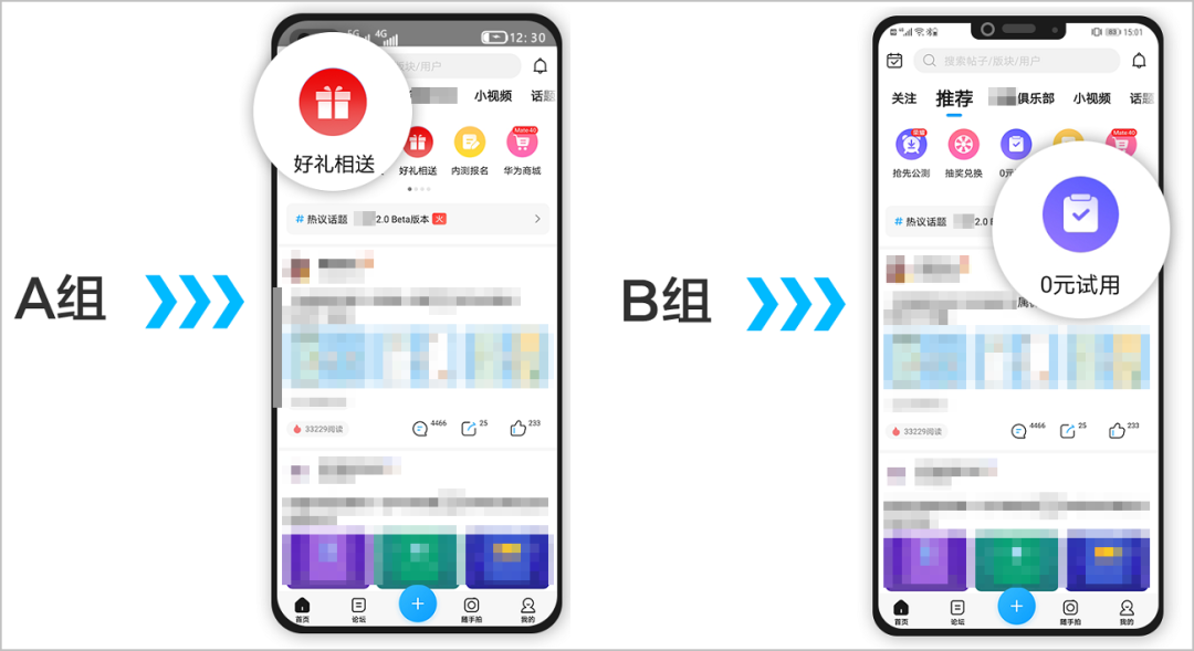 A/B测试是增长实验中重要的工具,通过对比测试对用户提供不同的功能,测试不同文案的点击效果,从量化的数字上来选择转化效果更优的一组。