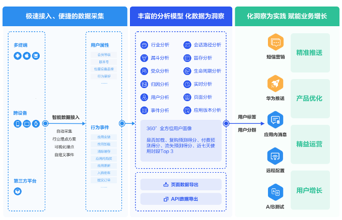 华为分析,提供数据接入、数据分析、用户生命周期、数据管理能力于一体,驱动企业实现精准拉新、产品优化、精益运营、业务增长。
