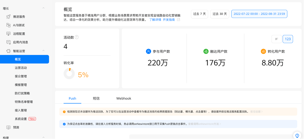 智能运营为市面上比较标准化的运营平台;预测服务提供3种算法人群预测;AB实验为基础的AB工具;华为分析,类似于神策分析的一个分析工具。