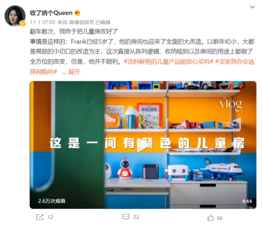换作红人视角下,获取更多涨粉、建立更大影响力始终是红人们始终在追求的目标,比如微博汽车博主@张恩博不止专注于汽车行业评论,更将内容拓宽至旅游、运动等多个领域;微博家居博主@收了纳个Queen则在家居好物推荐之外,分享起了自己与萌娃的生活经历,甚至偶尔客串设计师为粉丝出主意。