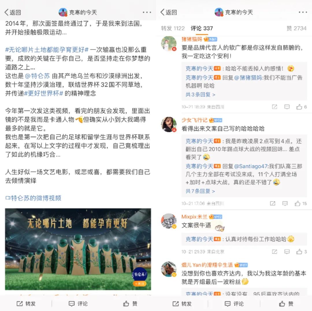此外,特仑苏也在此期间玩起了红人营销,其邀请@克寒的今天在微博分享自身在足球、留学生涯和世界杯之间的巧妙际遇,勾起了人们对历届世界杯的共同记忆,并传递出特仑苏“更好”的品牌理念。