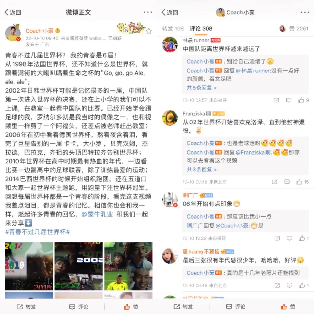 除了理想L9之外,蒙牛乳业也在微博找到了内容破圈的玩法。在今年世界杯预热期间,蒙牛借势世界杯拍摄了《世界杯40年回忆》视频,并邀请运动类博主@coach小豪结合自身经历过的6届世界杯讲述对今年世界杯的期待,引发粉丝积极讨论对世界杯的青春回忆。