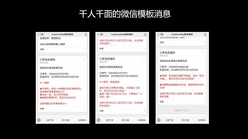 那么这个活动里,就需要做到用户的千人千面。比如周一要开单,你送了一张神秘的五折临时券,“仅此一张,24小时内有效”;那么到了周五或者周六的时候,微信页面模板消息要提醒“您本周已经消费6件商品,只差最后1件,周日瓜分500万现金”。