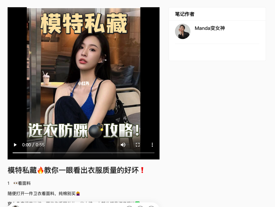 远了不说,拿top500里目前点赞最高的笔记来说,这也是一篇攻略教程类的笔记,主要是告诉你该如何选择一件质量好的秋冬衣服,虽然视频不长,但干货满满,目前单篇笔记已有15万点赞,但这位博主实际上并不算是KOL,目前账号粉丝只有6W,可见好的选题,比粉丝数重要多了。