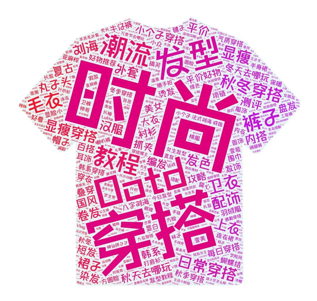可以看见时尚,ootd,穿搭等这几个词高频出现,但实际上这几个词更像是是类目通用词,没法用来得出结论,所以我们直接忽略,看能否找到穿搭类目下细分的主题。