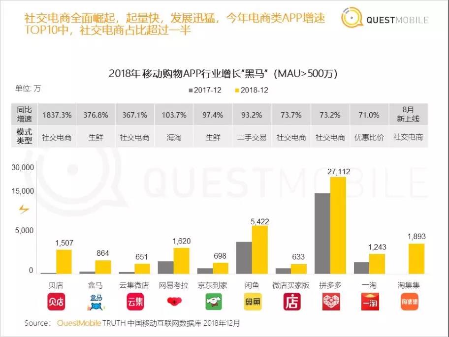 而在电商领域,也有不少 App 利用“社交”打出了自己的天地。由互联网专业数据机构 QUEST MOBILE 出品的《中国移动互联网2018年度大报告》显示,2018 年电商类 App 增速TOP 10 中,就有 5 家社交电商。