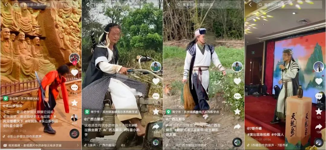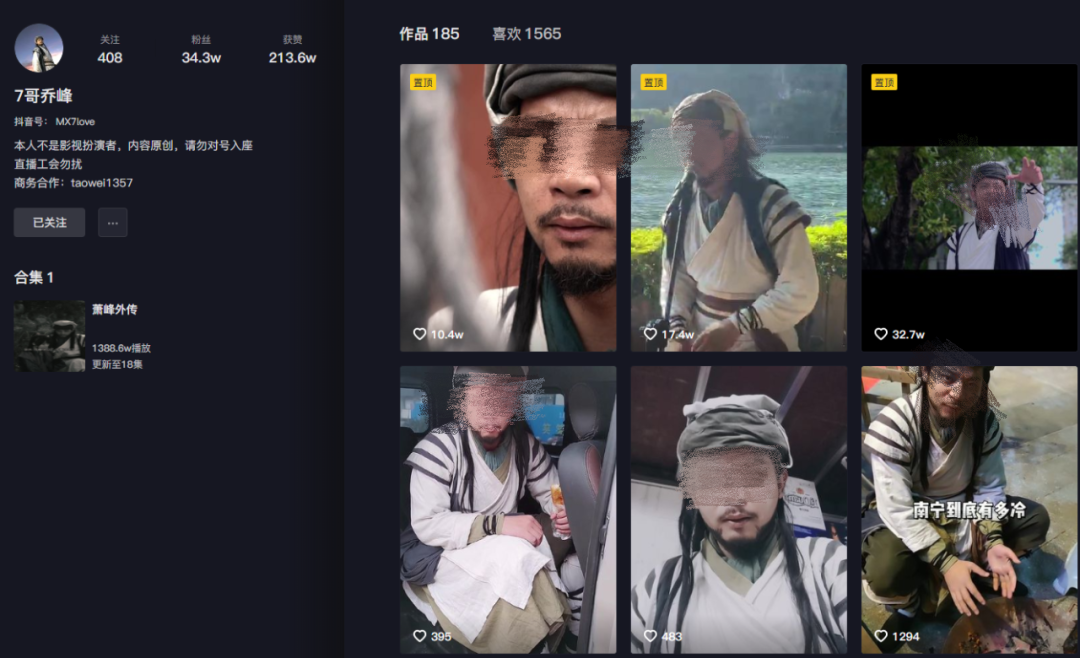例如@7哥乔峰,@乐山步惊云,@广西杨过等博主。因为模仿影视剧中很火的角色,每条视频都能获得几千点赞,甚至上百万点赞,一条视频涨粉数十万。