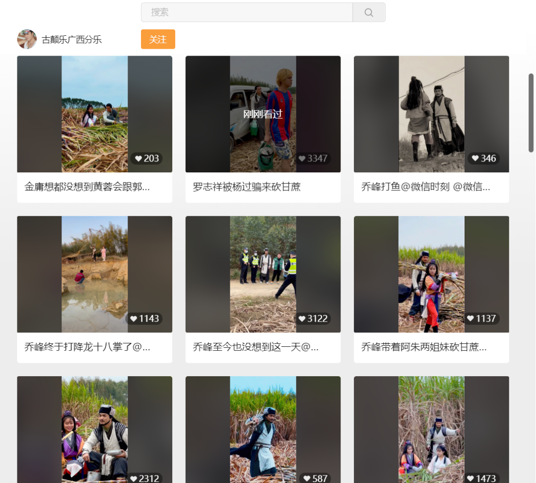 平时发布的视频,通常是模仿杨过(古天乐版本)在《神雕侠侣》里的剧情,又或者客串郭靖在《射雕英雄传》里的剧情。