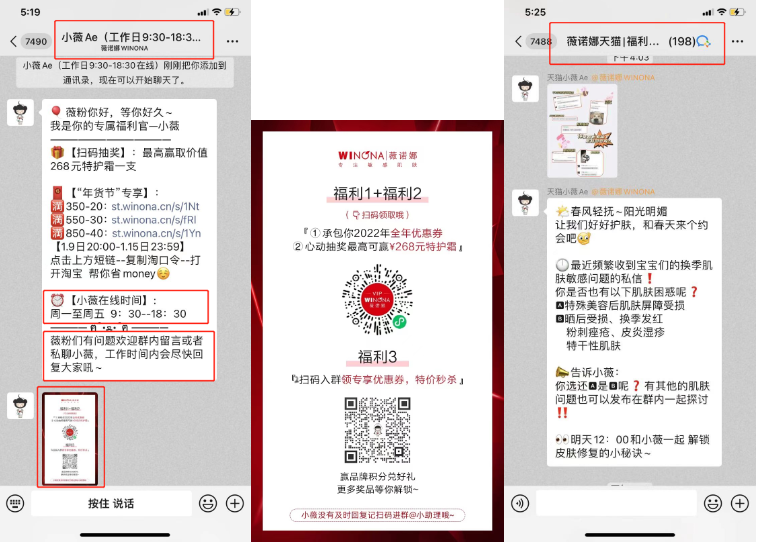 天猫渠道是小薇直接拉入【薇诺娜天猫福利社】,公众号渠道官方小薇会询问用户的肤质是油皮还是干皮,然后再拉入相对应的群。