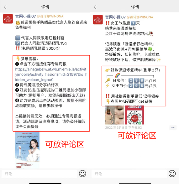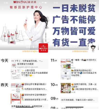 公众号渠道:官网小薇的朋友圈发送频次为2-4条,发布的内容主要为产品优惠为主,偶尔有用户互动、护肤知识分享、品牌。