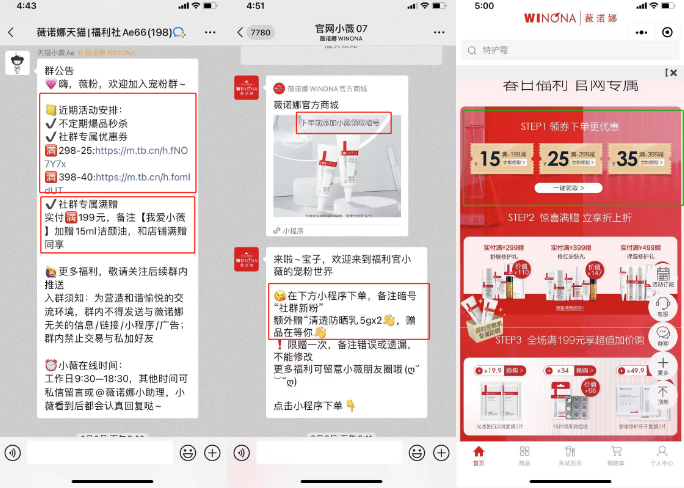 天猫渠道:社群新粉可以领取社群专属优惠券,在天猫实付满199原备注【我爱小薇】可以获得加赠小商品。