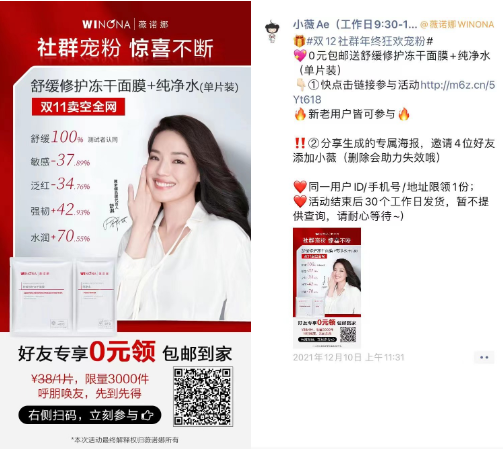 以明星作为海报封面,高级又有调性,明星效应一定程度上可以加强客户对品牌的信任度,再配合拉新福利可以拉动想要免费福利的客户主动申请专属海报分享给身边的好友闺蜜,完成拉新裂变的动作。