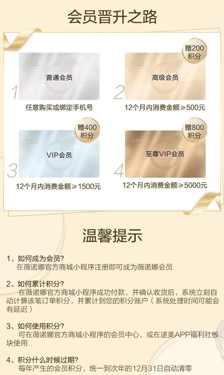 薇诺娜在小程序端建立了自己的会员积分体系,所有用户进入小程序注册登录即可成为薇诺娜会员,此时会员级别为普通会员,12个月内可以通过积分任务走上升级之路,最高级别为至尊VIP会员。