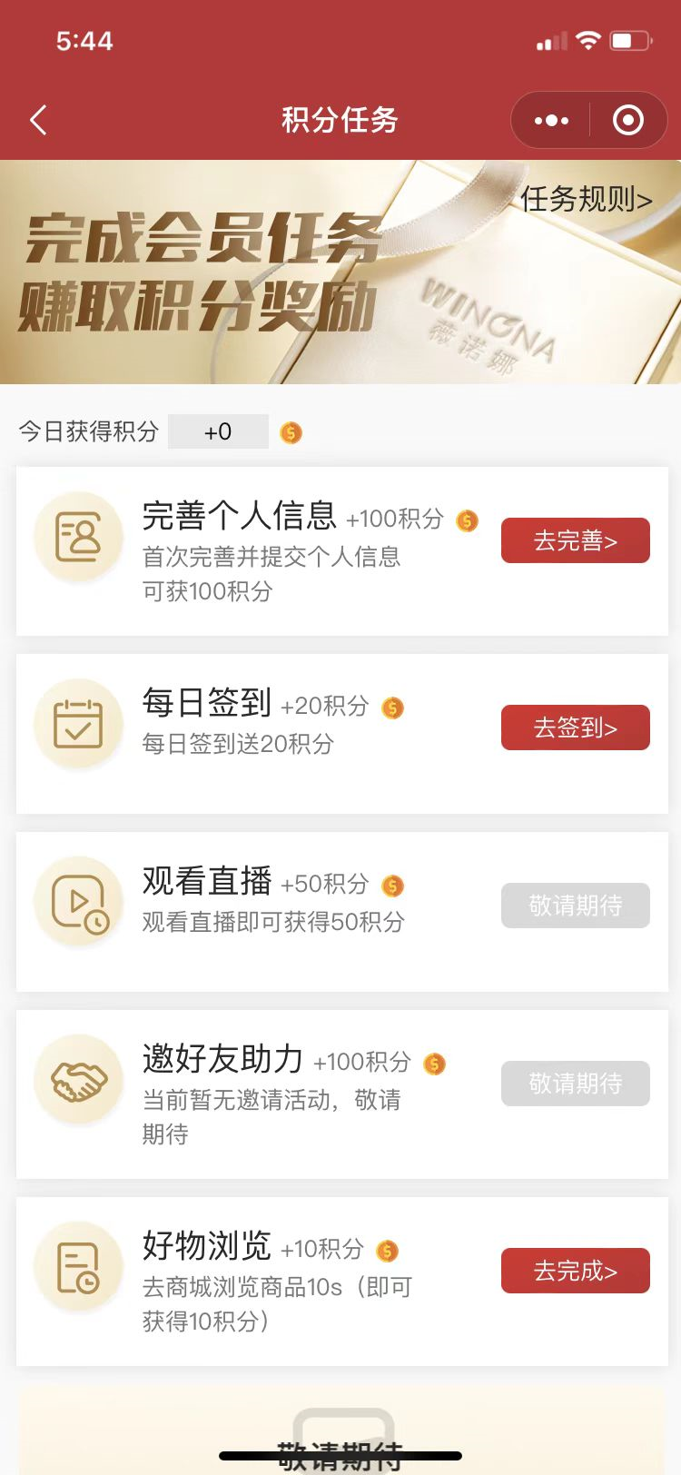 积分的获取方式目前正在实行的有【完善个人信息】【每日签到】【好物浏览】【购买产品】,暂未开放的有【观看直播】【邀请好友助力】。