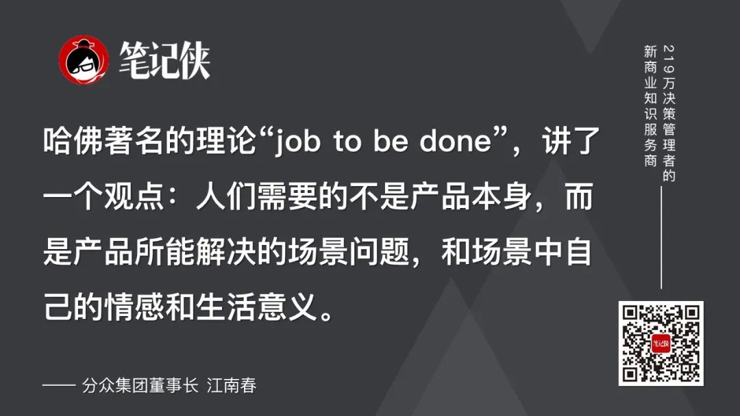 哈佛著名的理论“job to be done”,讲了一个观点:人们需要的不是产品本身,而是产品所能解决的场景问题,和场景中自己的情感和生活意义。