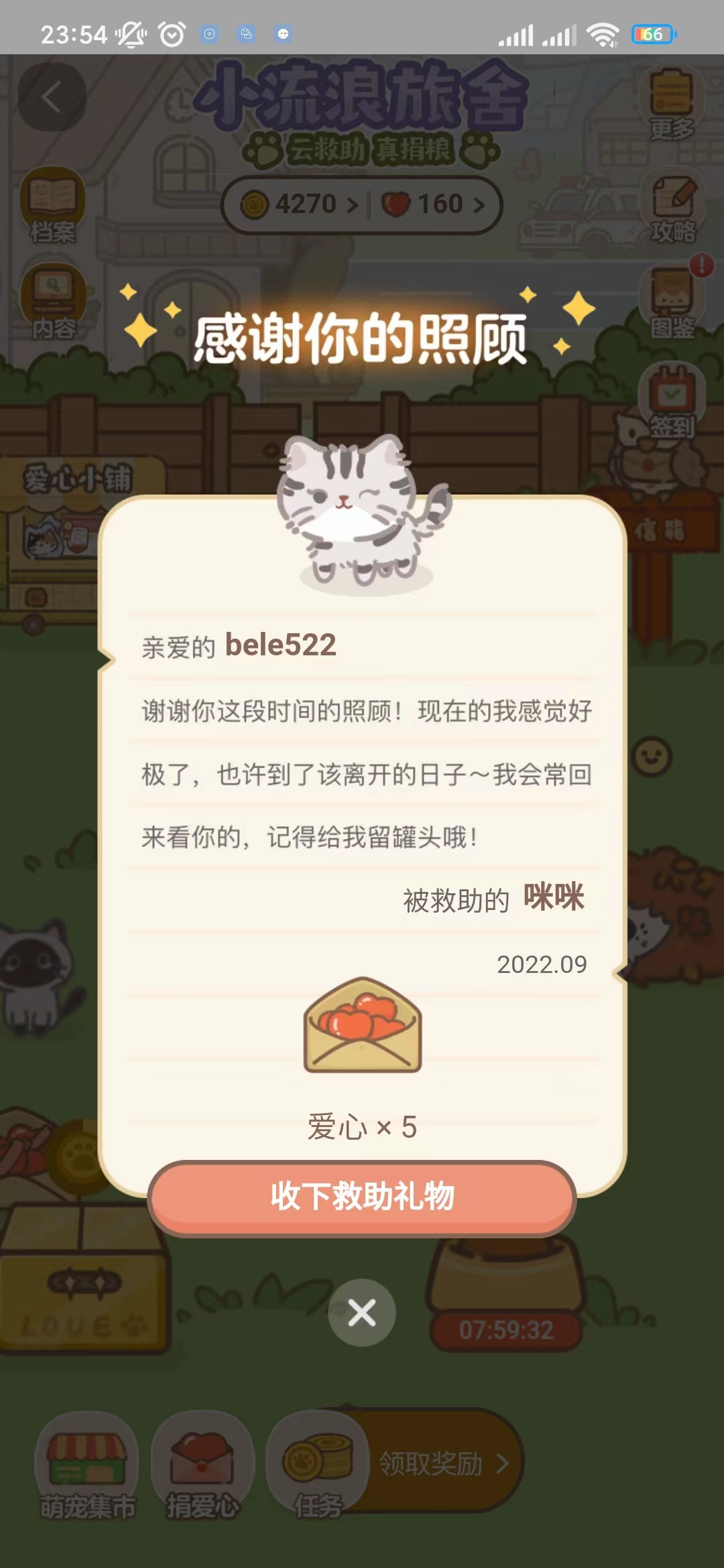 放置的食碗需要8小时添加一次粮,募捐箱4小时装满,这样的明确时间的模式,能够让用户在固定的时间段打开游戏。