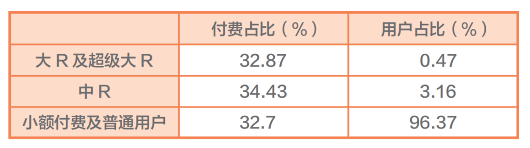 - 普通用户中,5%会上升为付费用户,1.3%上升为中R,还有0.92%上升到大R(含超级大R)。