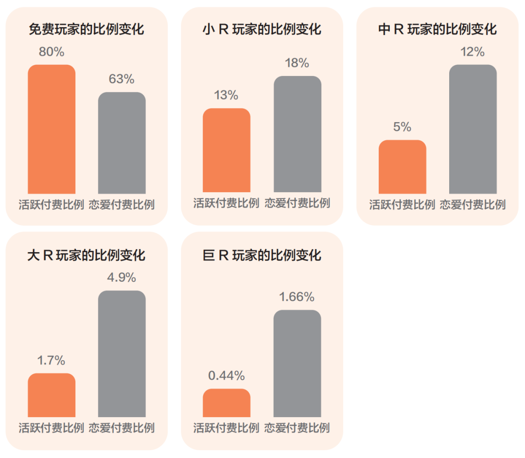 - 在亲密关系影响下,中R用户中有8%上升为大R(含超级大R)。