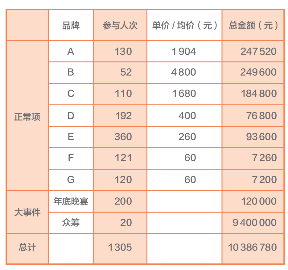表格中“正常项”是社群成员日常发起的大型团购,当时被统计至少有7次,参与成员人均799元。实际发生团购或商业活动要超过这个数字,只是因为当时没有记录或者金额太小而被遗漏在外。