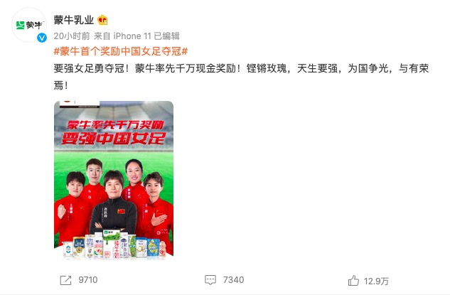 事实上,近几年,不止于世界杯,蒙牛也在其他赛事领域展开体育营销,持续坚持输出品牌的价值。从2019年蒙牛成为最早签约谷爱凌的中国品牌,到今年中国女主重返亚洲之巅,蒙牛迅速跟进对女足进行奖励,每一步都显示出了蒙牛对体育营销的敏锐感知。