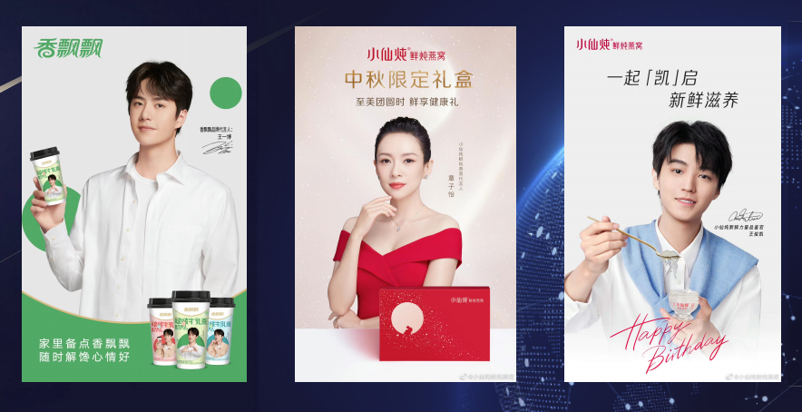 当利用章子怡把天花板占住之后,它下一步开始找年轻人里的顶流王俊凯。虽然它在品牌物料的呈现上远远不如香飘飘,因为王俊凯的应援色其实是蓝色,但品牌增长是香飘飘的数十倍、数百倍。