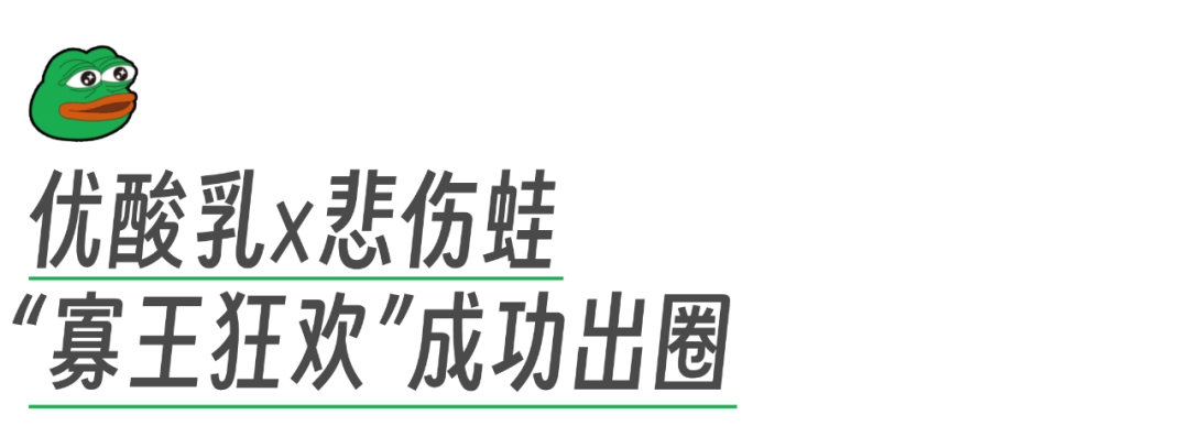 由此,优酸乳在11月为年轻朋友找到了一个情绪宣泄的出口:联动全球知名IP悲伤蛙PEPE,一起打造了一场「寡王」狂欢。围绕#优酸乳好汽哦#核心主题,优酸乳的这场联名营销动作之密集,可谓是波波皆能引发流量高潮。