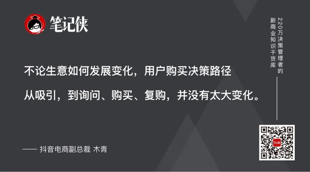 实际上,不论生意如何发展变化,用户购买决策路径从吸引,到询问、购买、复购,并没有太大变化。