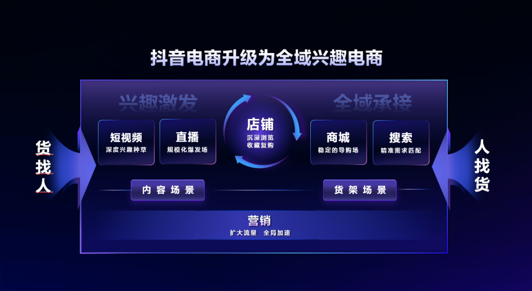 换言之,全域兴趣电商除内容推荐场景的货找人,也覆盖用户主动搜、主动逛场景,最终满足后半链路的“人找货”。