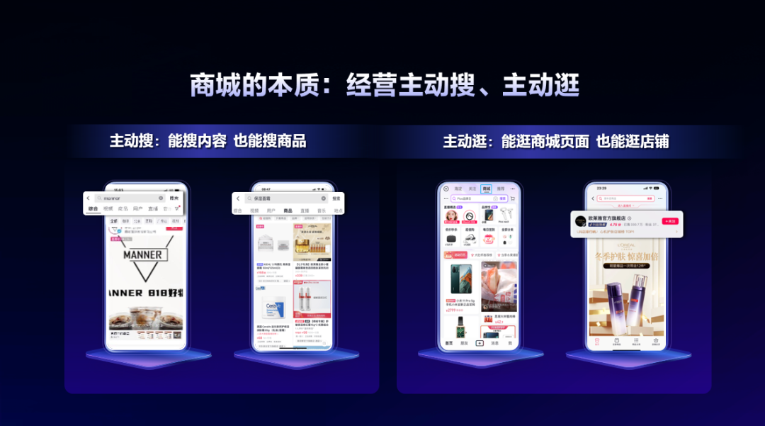 搜索能够帮助用户精准匹配自己想搜的商品,商城可以帮助商家,承接用户主动逛的需求,用户各种电商行为,都会沉淀至店铺中。
